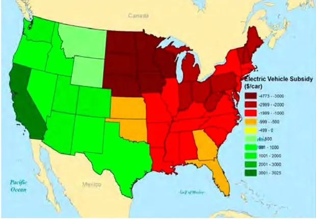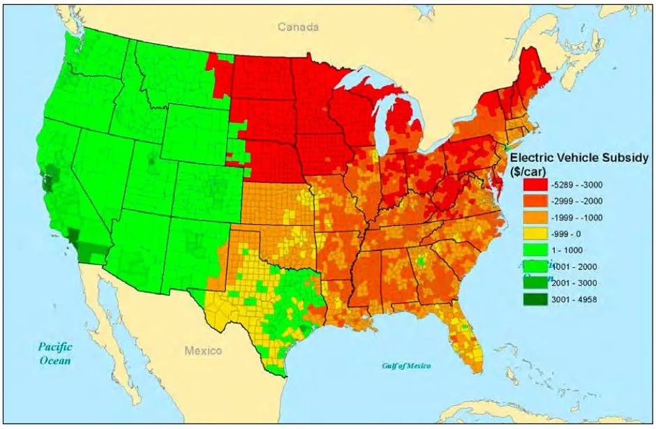 下面的地图显示了按县计算的补贴:深绿色的地区值得获得高达$5,000的补贴;深红色的地区则应征收超过$5,300的税。