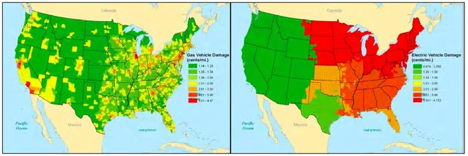 “事实证明,西部比东部干净得多。”对于汽油车,计算环境损害相对简单。研究人员考虑了汽车的燃油效率评级(城市县的城市里程,非城市的高速公路里程)、污染物扩散(如平均风向)和环境损害的数量(对健康、基础设施、作物等的影响)。这些数据共同提供了在特定美国县驾驶某款汽油车一英里所产生的总排放。
