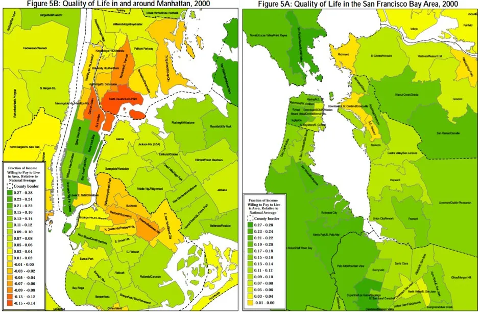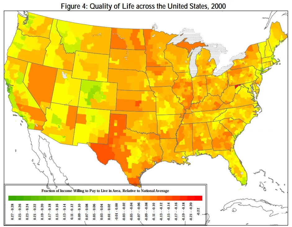 一项 新研究 发表在 城市经济学杂志,由经济学家 大卫·阿尔布伊(伊利诺伊大学)和 伯特·吕(密歇根大学)提供了关于美国人愿意为居住在特定地区和获取改善生活质量的设施支付多少的重要新见解。该研究考察了全国超过2000个社区。我之前曾写过 生活质量指数,但这些经济学家的研究的强度在于其具体性。利用人们愿意为居住在特定地区支付的费用作为该地区生活质量的衡量标准,这些经济学家的新指数不仅在大都市之间进行比较,还在其内部进行比较。