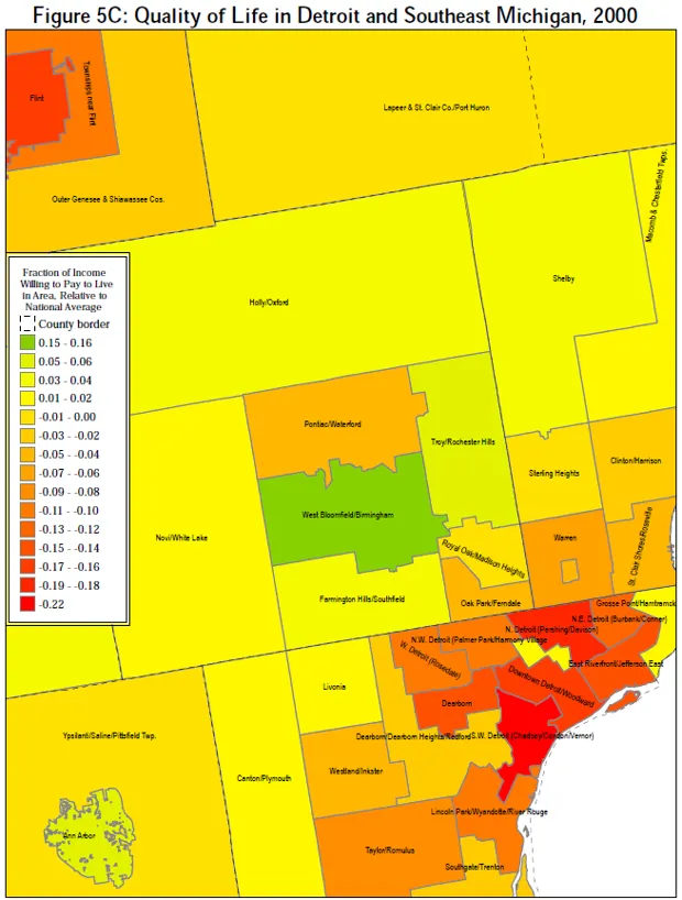 底特律的情况则截然不同,如下图所示。很少有社区的居民愿意支付溢价:只有西布隆菲尔德和伯明翰这两个富裕的郊区。相比之下,底特律市中心及邻近社区如迪尔伯恩高地、东河岸和珀辛,生活质量评级在全国范围内都是最低的。位于城市西北部的弗林特在生活质量指标上也表现不佳。
