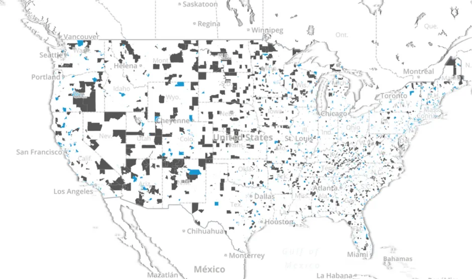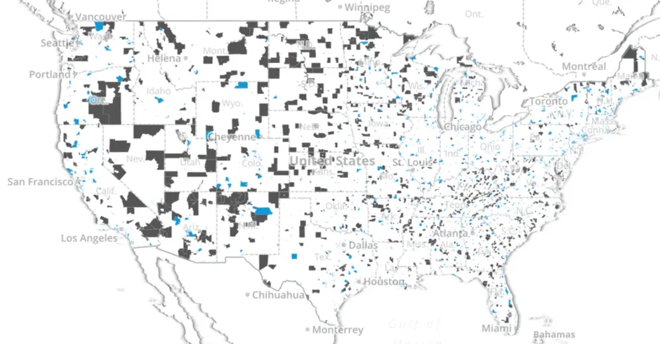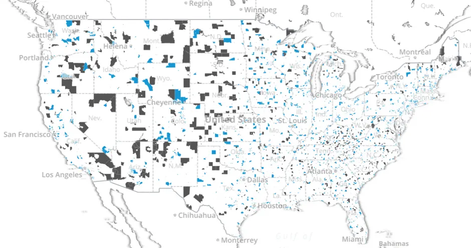 2010年,优势地区的前10%(蓝色)和后10%(黑色)。后10%已经发生了变化并扩散,尤其是在南部和西部。城市研究所“靠近优势指数的顶部或底部的社区在该指数的四个组成部分中都是全国最有优势或最不利的,”报告中写道。“因此,指数在极端情况下的含义很容易解释:要么所有因素都很高,要么它们都很低。”
