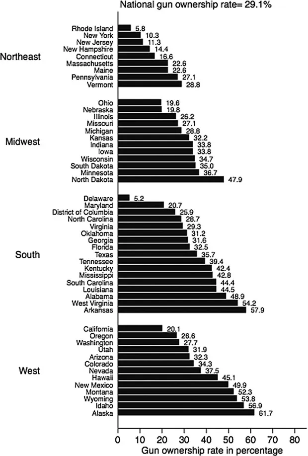 彭博社城市实验室一位艺术家重新构想童年的空间,结果颇具挑战性房地产开发商纳夫塔利在迈阿密海滩寻找交易,推动佛罗里达发展美国的驾驶和拥堵率创历史新高海牙成为全球首个禁止石油和航空广告的城市他们的其他发现包括:拥有更高枪支拥有率的州,枪支死亡率也更高。(他们进行调查的年份,2013年,全国发生了33,636起与枪支相关的死亡事件。)阿拉斯加在每人拥有枪支数量方面名列第一,近62%的公民拥有枪支;特拉华州则以约5%的比例位列最后。而拥有枪支与“社会枪支文化”密切相关,后者被定义为拥有武装的朋友或家人,或参与与枪支相关的团体活动。