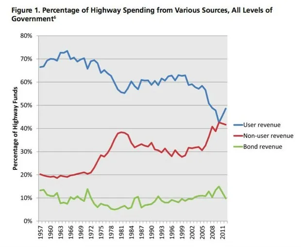 理想情况下,每位司机都应承担使用道路的个人费用——这是真正的“用户”费用,似乎是公平的。实际上,这 从来不是这样。司机费用如燃油税曾占道路成本的约70%,但由于上述许多原因,这一联系在几十年间逐渐减弱。结果是,道路成本不仅在司机之间分配不均,也在非司机之间分配。一项每英里驾驶费用将是对这一“用户支付”理想的回归。