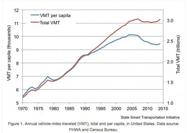 除了每加仑英里数和建设成本,美国人开车的频率显著下降。人均车辆里程远低于2000年代中期的峰值——一种 新常态,这表明我们不能像过去那样考虑资金(或建设)高速公路 了。
