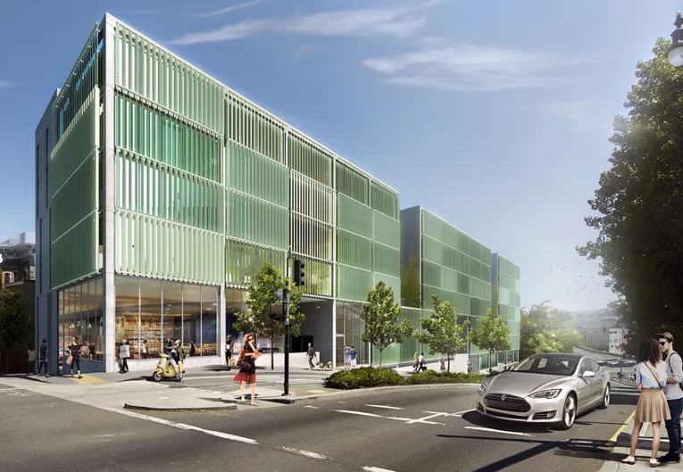 沿着Octavia,270英尺长的墙被三个深切口分成可管理的部分——一个从下方切入,两个从上方切入——这些是21世纪对一个世纪前塑造大型建筑的采光井的更新。在市场处,船头收窄成一个切割的边缘,三面都用百叶窗覆盖的玻璃标记了这个位置。