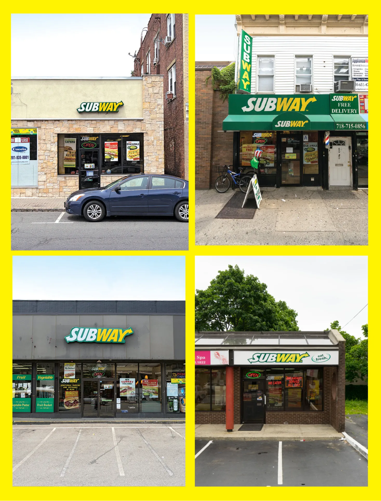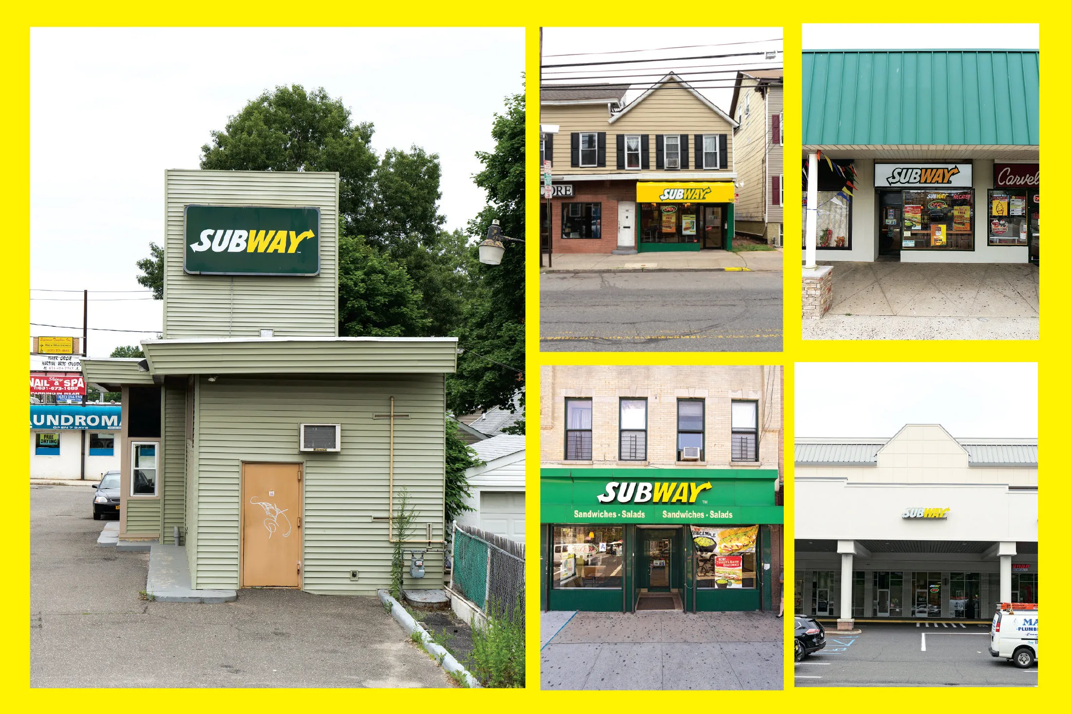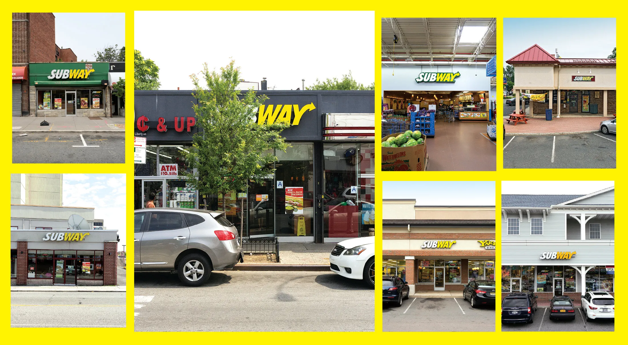 (从左下角顺时针方向) 纽约亨普斯特德待售的赛百味;新泽西纽瓦克;布鲁克林;纽约科马克;新泽西南边布鲁克;弗里波特;和新布伦瑞克。