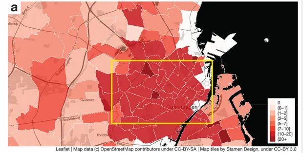 大哥本哈根地区的地图,按教区划分,颜色表示每次扫描发现的路由器平均数量。PLOS One作者们开发了一款Android应用程序,使他们能够访问任何下载该应用的手机的Wi-Fi时间序列(再次强调,这种访问在大多数Android应用中是常见的)。他们为63名学生参与者配备了加载了该应用的智能手机,这些参与者的日常生活方式各不相同,然后分别每5分钟和16秒收集他们的GPS和Wi-Fi数据,持续六个月。在这段时间内,参与者遇到了中位数为20,000个Wi-Fi路由器。