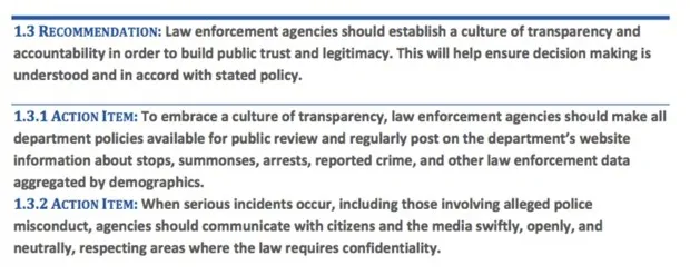 总统21世纪警务工作组FOP引用的建议是关于警察不当行为的,而不是在骚乱和示威期间的行为。然而,工作组报告中确实有一部分关于人群控制的内容,FOP可能错过了。内容如下: