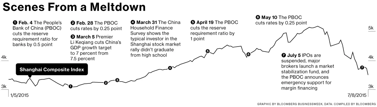 习近平主席的政府在其重新膨胀泡沫的运动中并不含蓄,而这泡沫的形成中它扮演了重要角色。政府已暂停首次公开募股,并放宽了保证金贷款的规定,甚至允许投资者以其房屋作为抵押借款购买股票。6月27日,中国人民银行降低了基准利率和某些银行所需持有的准备金。几天后,它向21家承诺购买价值1200亿元人民币(193亿美元)股票并持有一年的券商提供了金融支持。7月8日,中国证券监管机构禁止主要公司股东(持股超过5%)、企业高管和董事在六个月内出售其股票。