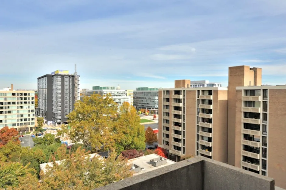 台伯岛合作住房,在右侧。Zillow在七月四日,一个小女孩正在华盛顿特区的台伯岛合作社拜访她的朋友。一名保安告诉女孩,她不能在广场上骑滑板车。这是规则。