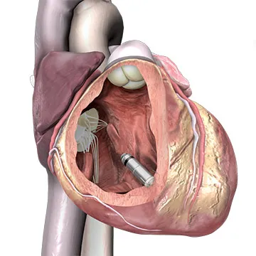 **安装:**外科医生通过将其滑入通过股静脉引导的导管,将迷你起搏器植入心脏的右心室。