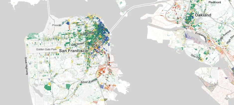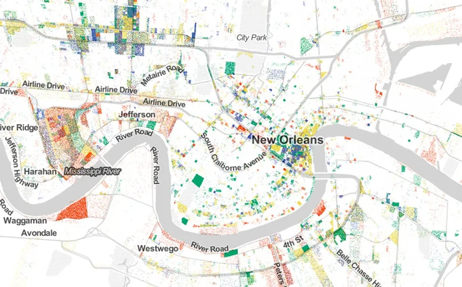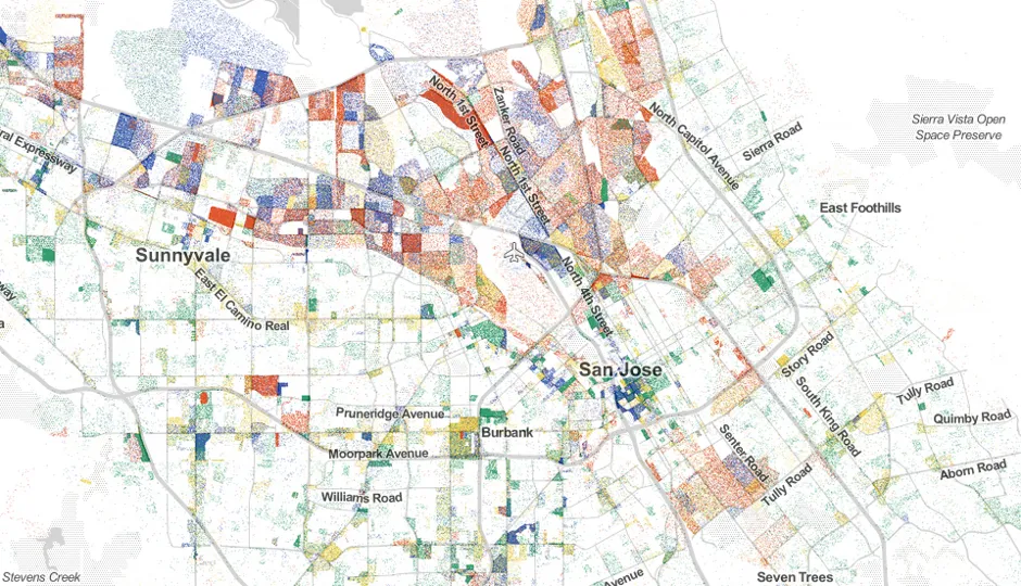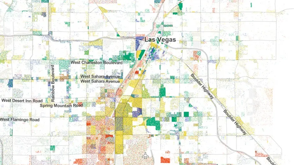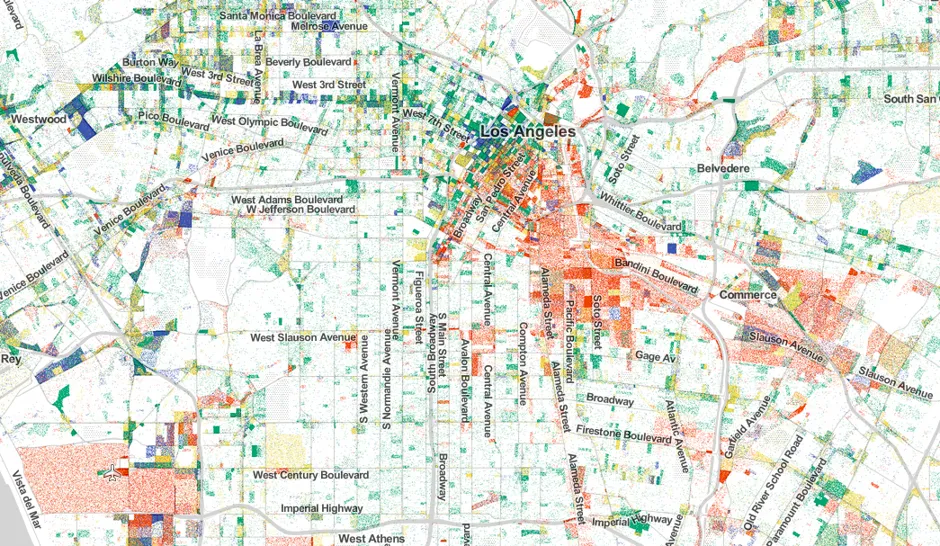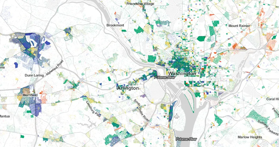 罗伯特·曼杜卡美国最好的种族可视化之一可能被称为点彩画。通过为全国每一个登记在册的人口绘制一个点,并根据种族进行颜色编码,弗吉尼亚大学韦尔登·库珀公共服务中心的团队将抽象的社会数据变得痛苦而个人化。