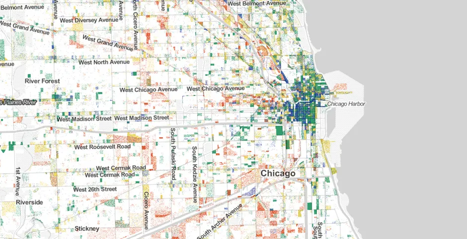 罗伯特·曼杜卡,哈佛大学社会学博士生和制图师,将点的力量带入了一个新的数据集:工作。使用2010年LEHD人口普查数据,以及使种族点图得以实现的大部分代码,曼杜卡创建了一个互动地图,每个工作地点都有一个点。