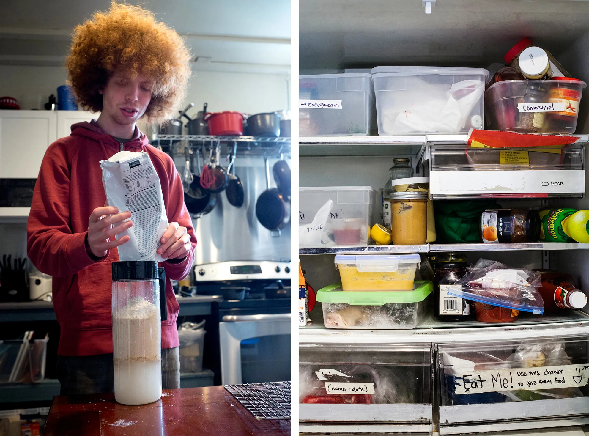 程序员 Ozzie Gooen 混合一批 Soylent,这是一种替代餐产品(左)。公共冰箱(右)。摄影师:Ashley Gilbertson 为彭博商业周刊