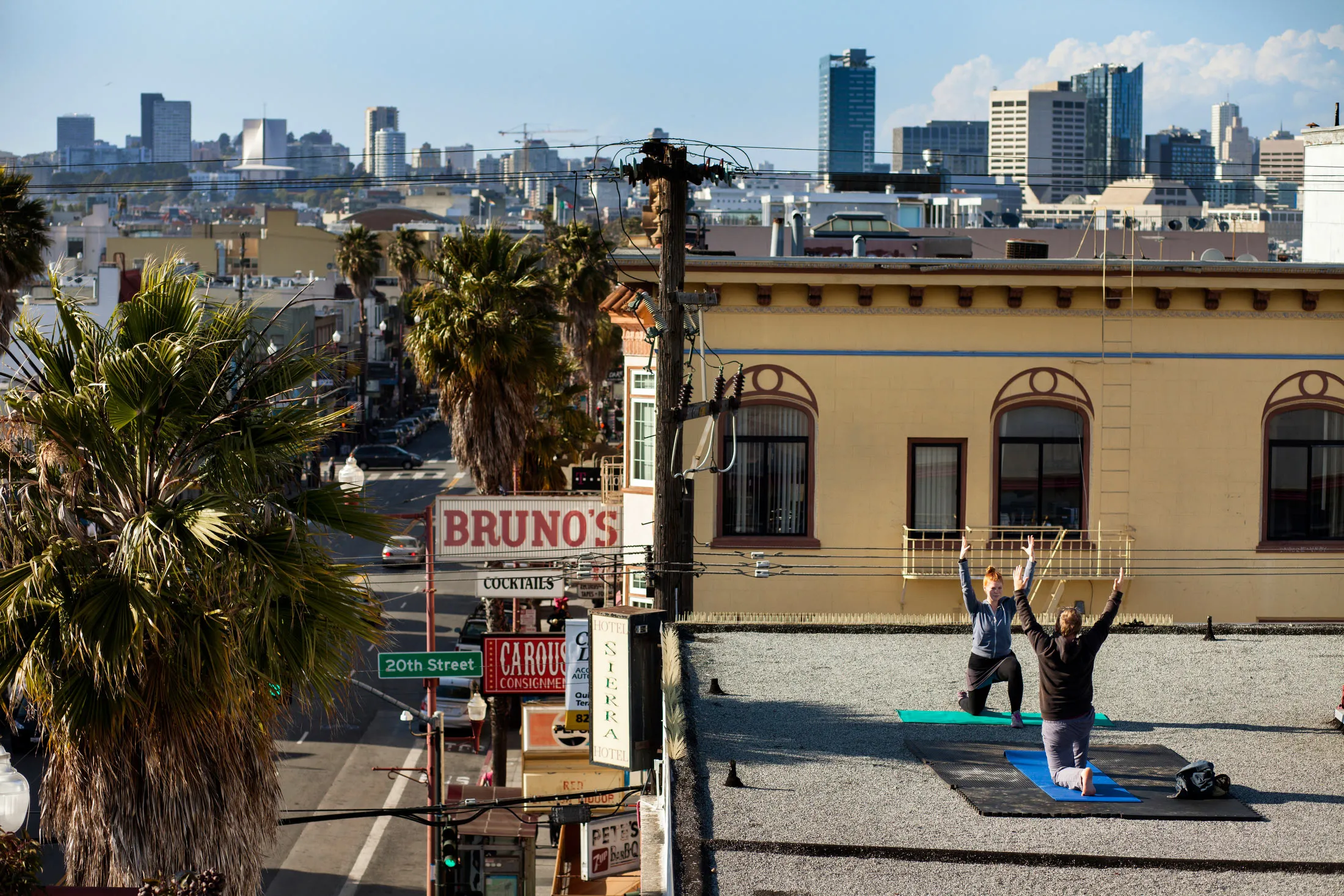 前居民 Kat Shreve 在屋顶上主持每周的瑜伽课程。