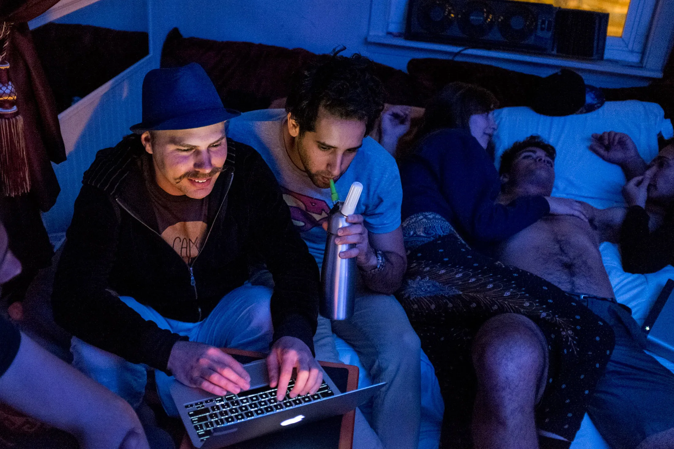硬件公司Net Ninja的创始人阿多尼斯·盖塔齐斯与应用开发者利奥尔·纽纳一起吸食笑气(氧化亚氮:去问爱丽丝),而一些朋友则在相互了解。