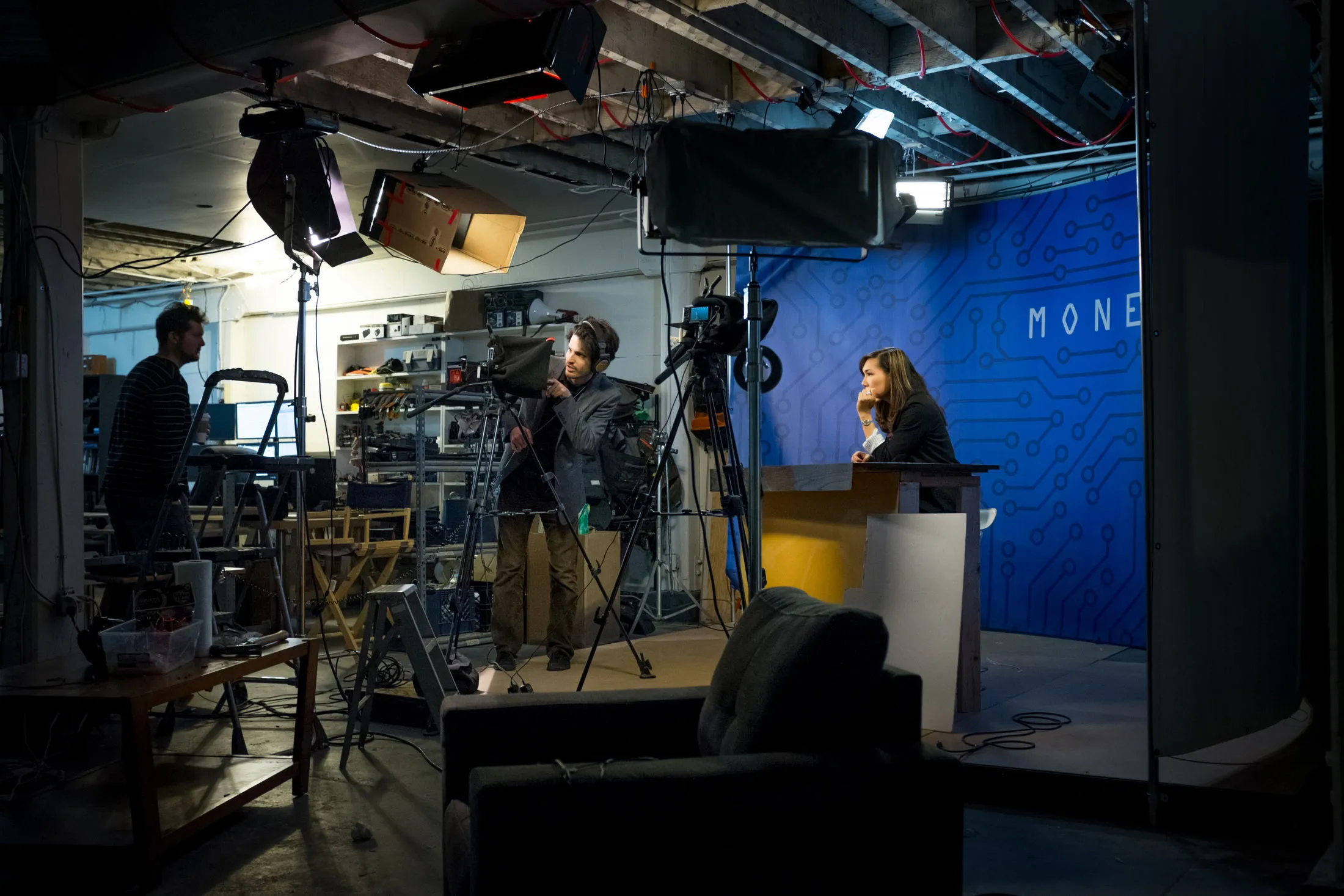 居民泰勒·博尔曼、希默斯·卡尔德和杰西卡·沃在金钱与科技的地下室布景上。