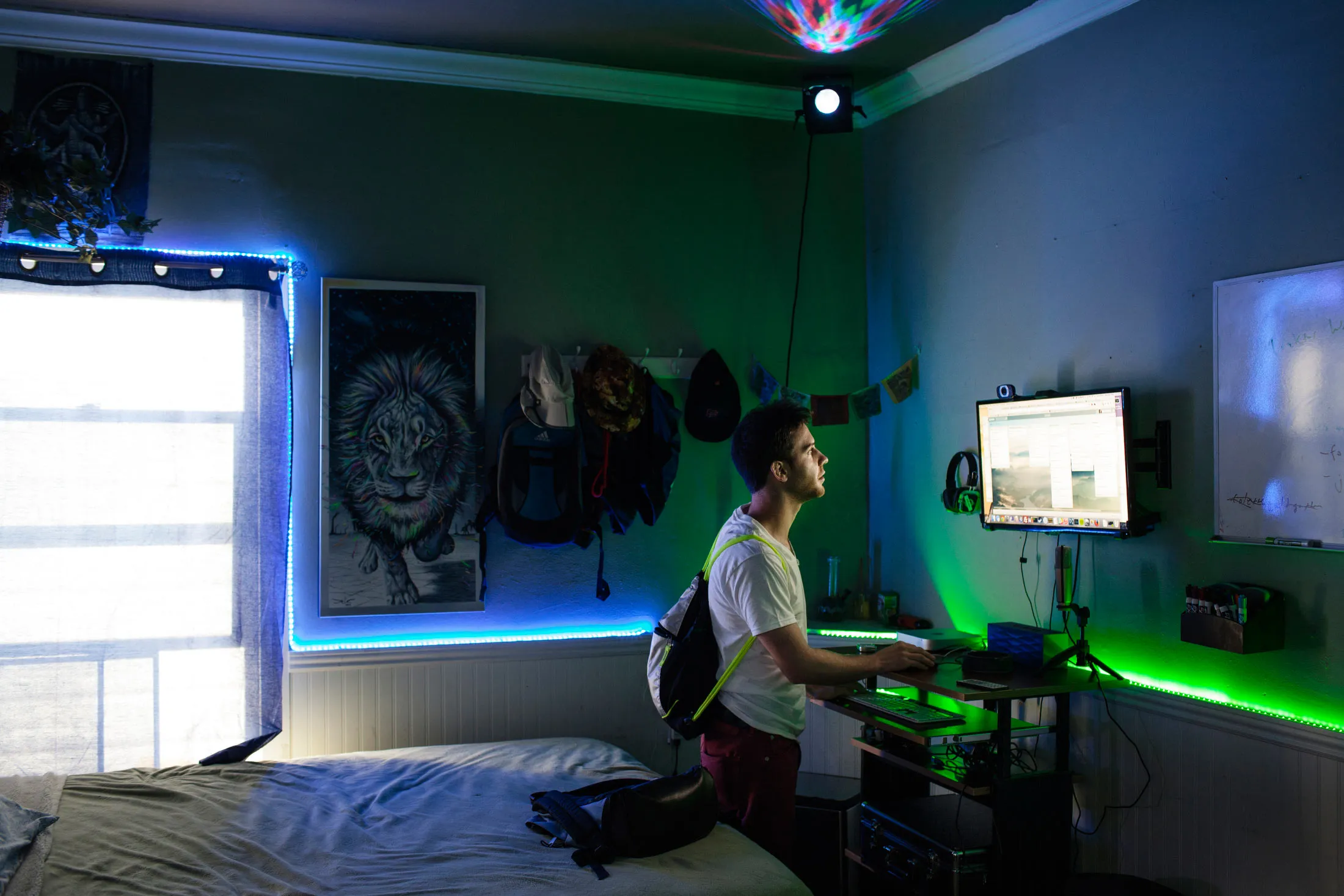 格林伯格,一名软件工程师和初创公司glowyshit.com的创始人,在他的房间里。