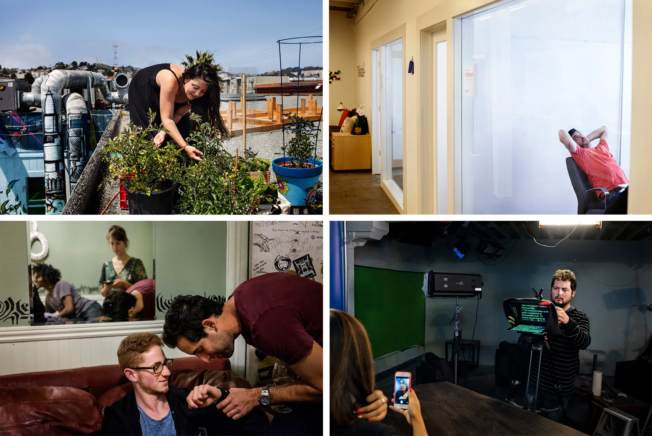 从左上角顺时针方向:戴安娜·布鲁克斯在屋顶种植蔬菜;布拉德·卡姆,Talkable的总裁,这是一个电子商务网站的推荐平台,在他位于旧金山SoMa社区的办公室(他在20Mission住了超过两年);居民亚当·斯通向纽纳展示他的苹果手表;居民博尔曼、希默斯·卡尔德和杰西卡·沃在节目的地下室布景上。