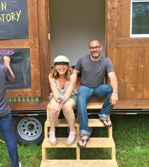 埃丝特·罗宾逊和盖·巴克尔在靠近皇后博物馆的ArtBuilt移动工作室的台阶上。瑞亚·塞赫加尔### 痴迷于微型房屋