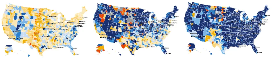 从左到右:2010年至2030年白人、黑人和西班牙裔社区的人口变化。深蓝色表示增长高达40%,而深红色表示下降高达40%。有关更多细节,请参见互动工具。城市研究所其次,至少有一些市政当局必然会认识到,房主并不关心他们城市的最佳利益,而是通过极端限制分区来实现。