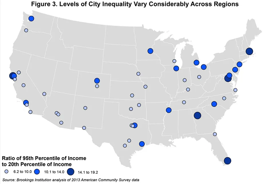 “在50个最大城市中,收入在第95百分位的家庭收入是第20百分位家庭的11.6倍,”一份布鲁金斯学会关于城市与不平等的报告中写道。该报告发现,城市中的不平等差距比全国整体更大。