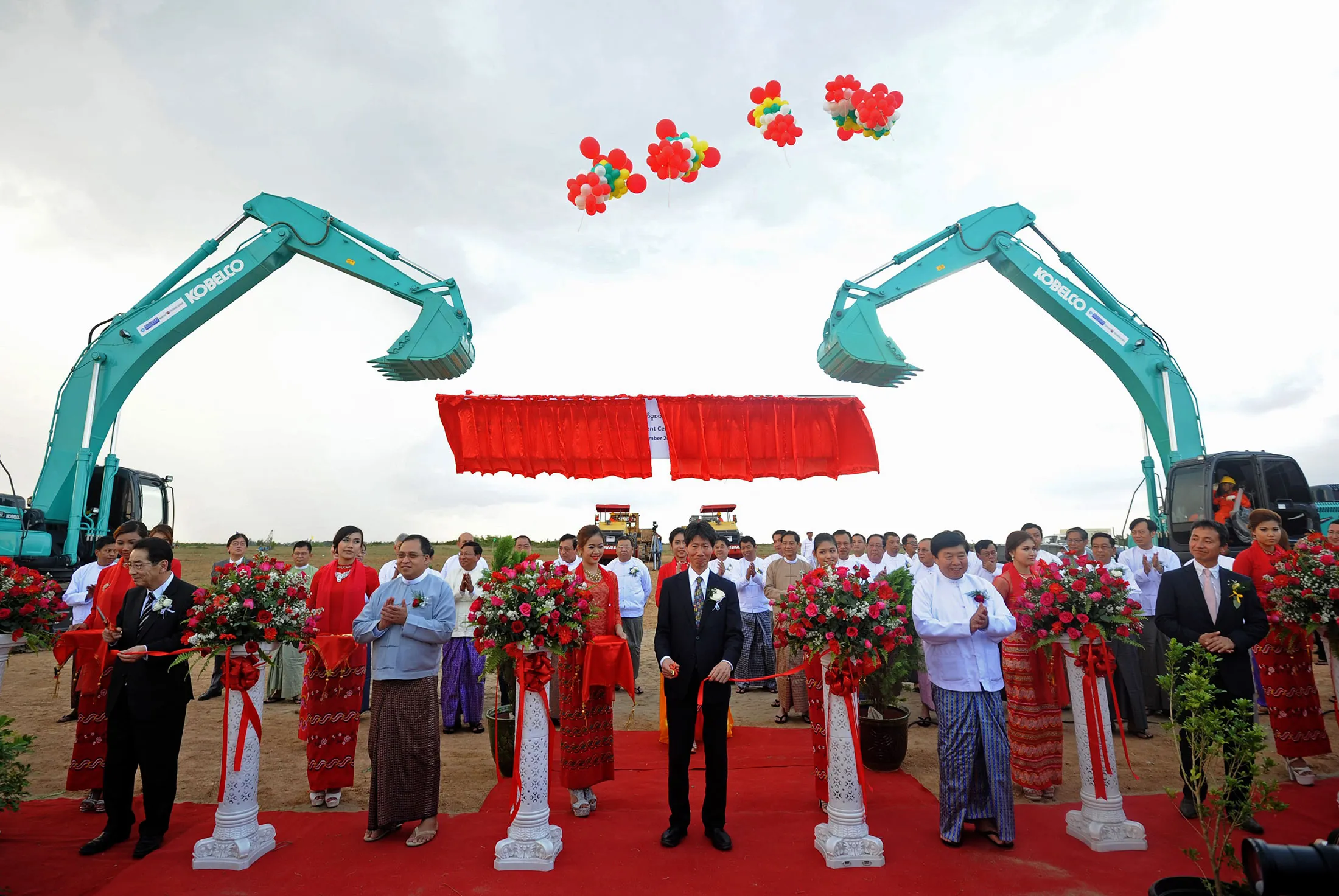 磯崎善彦(中),日本经济、贸易和工业部副部长,2013年11月30日在缅甸提洛瓦为提洛瓦特别经济区项目剪彩。