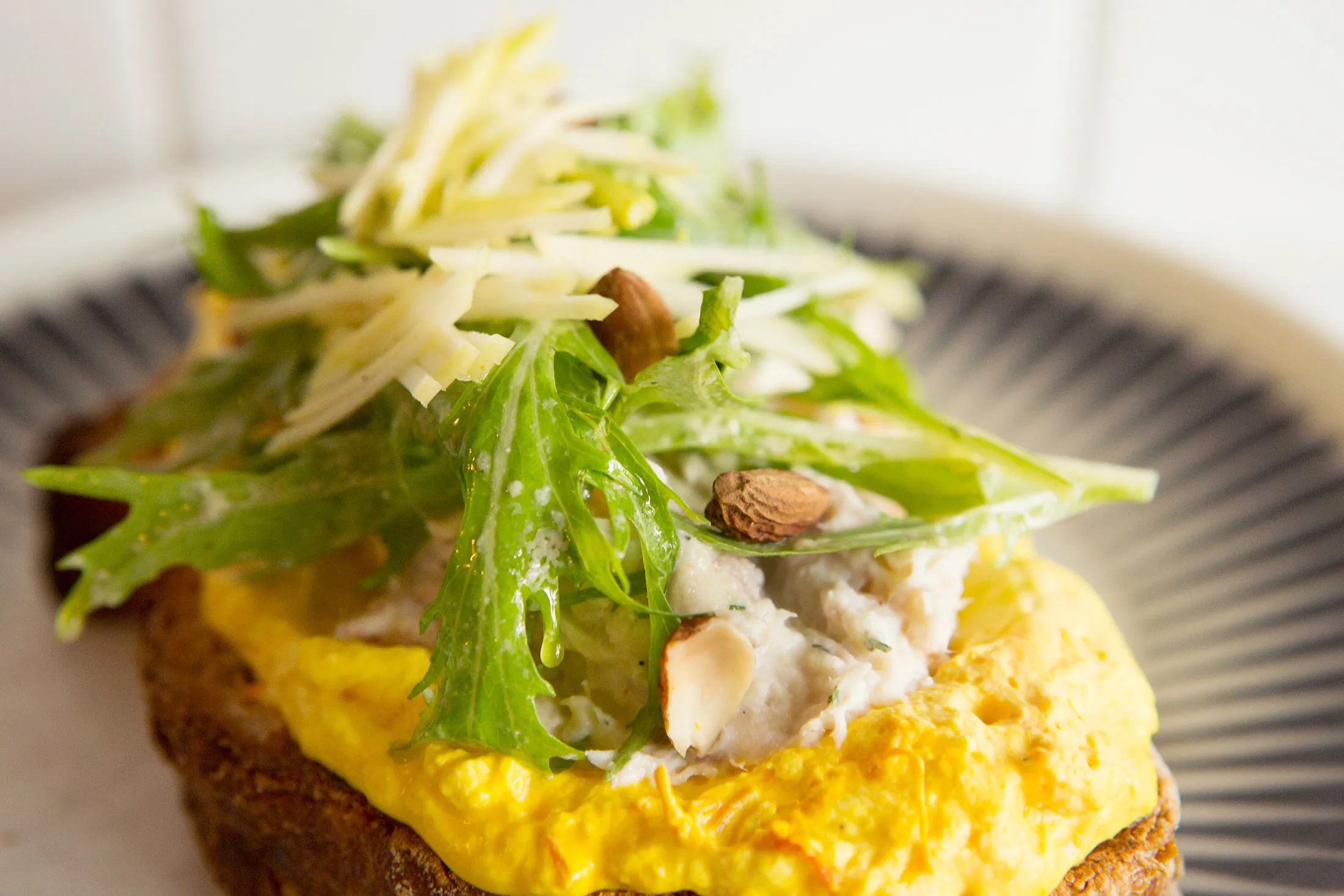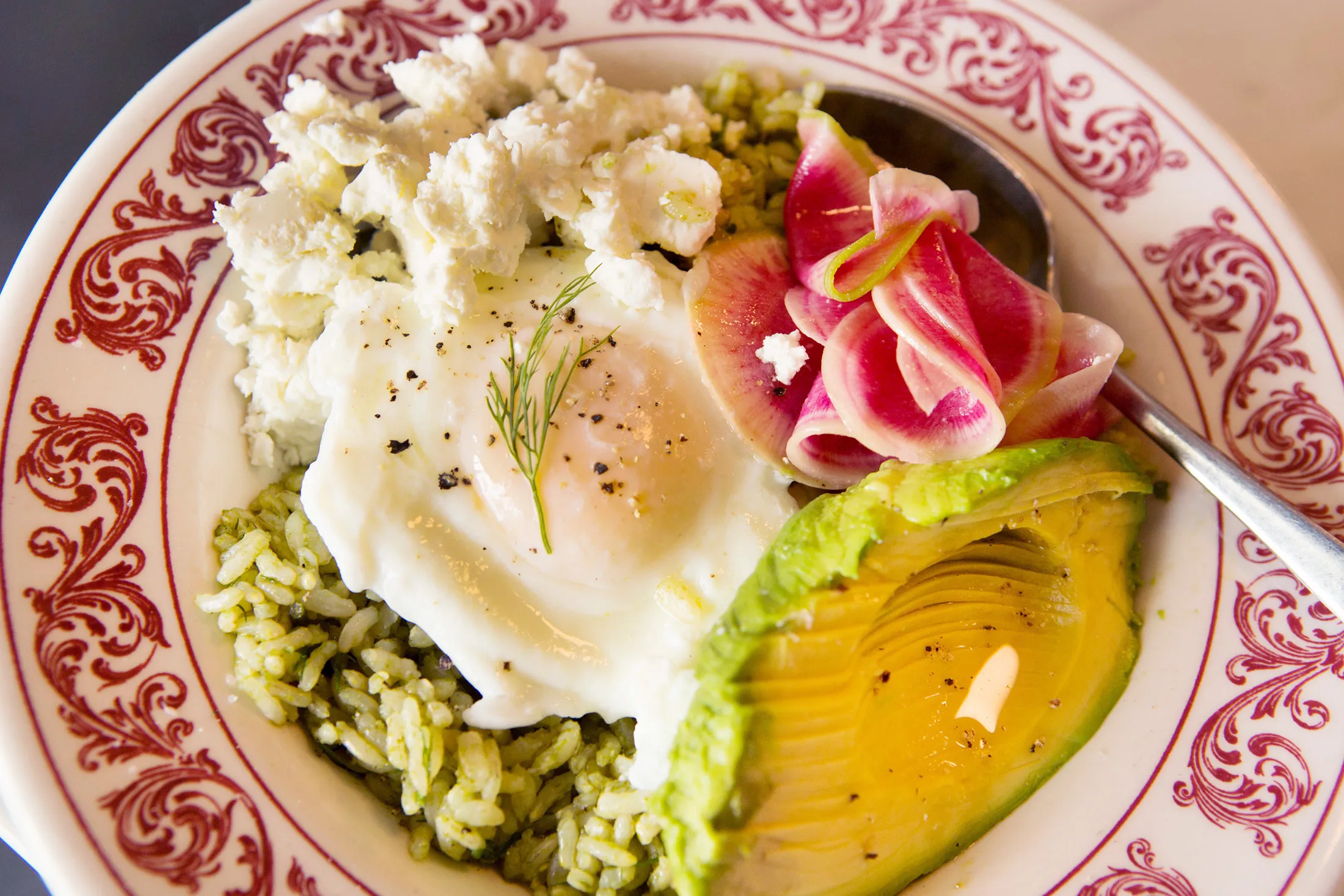 Sqirl 最受欢迎的菜肴是酸模香蒜酱米饭碗。在许多方面,它代表了科斯洛对味道和食物的思考。她从米饭开始,使用的是 Kokuko Rose 棕色米,丰富而土壤气息,略带咸味,准备得有点脆。她知道自己想用那种看起来普通且乏味但远非日常的米饭做点什么。她手头还有柠檬酱,因为她总是有很多酱料。这是她的基础。在思考接下来该做什么时,她想起了最近吃过的一道酸模和三文鱼的菜肴,味道是多么好,风味是多么和谐。但如果酸模是主角呢?她做了一个酸模香蒜酱,把它加入米饭和梅耶尔柠檬酱中,洒上一些辣酱,加入当季的萝卜,以及她最近发现并疯狂喜爱的法国羊奶酪。然后,为了增加蛋白质,她加了一个水煮蛋。