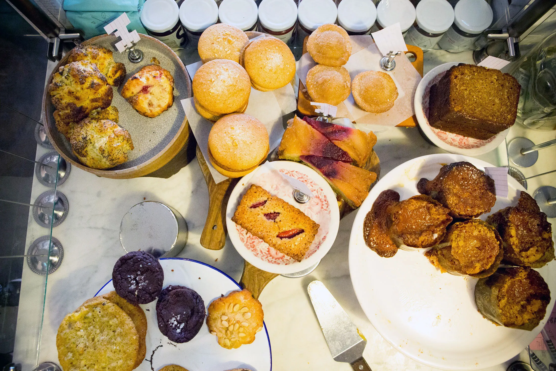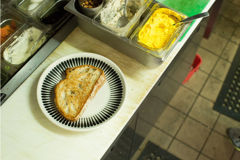 Sqirl的一名服务员即将用一些慷慨堆满、溢出果酱的吐司让某人的一天变得美好。