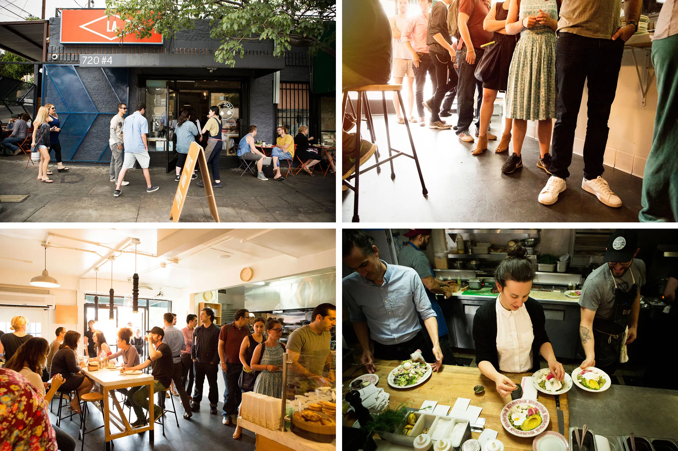 食客们坐在外面享受Sqirl的新鲜、酸爽、美味的菜肴。