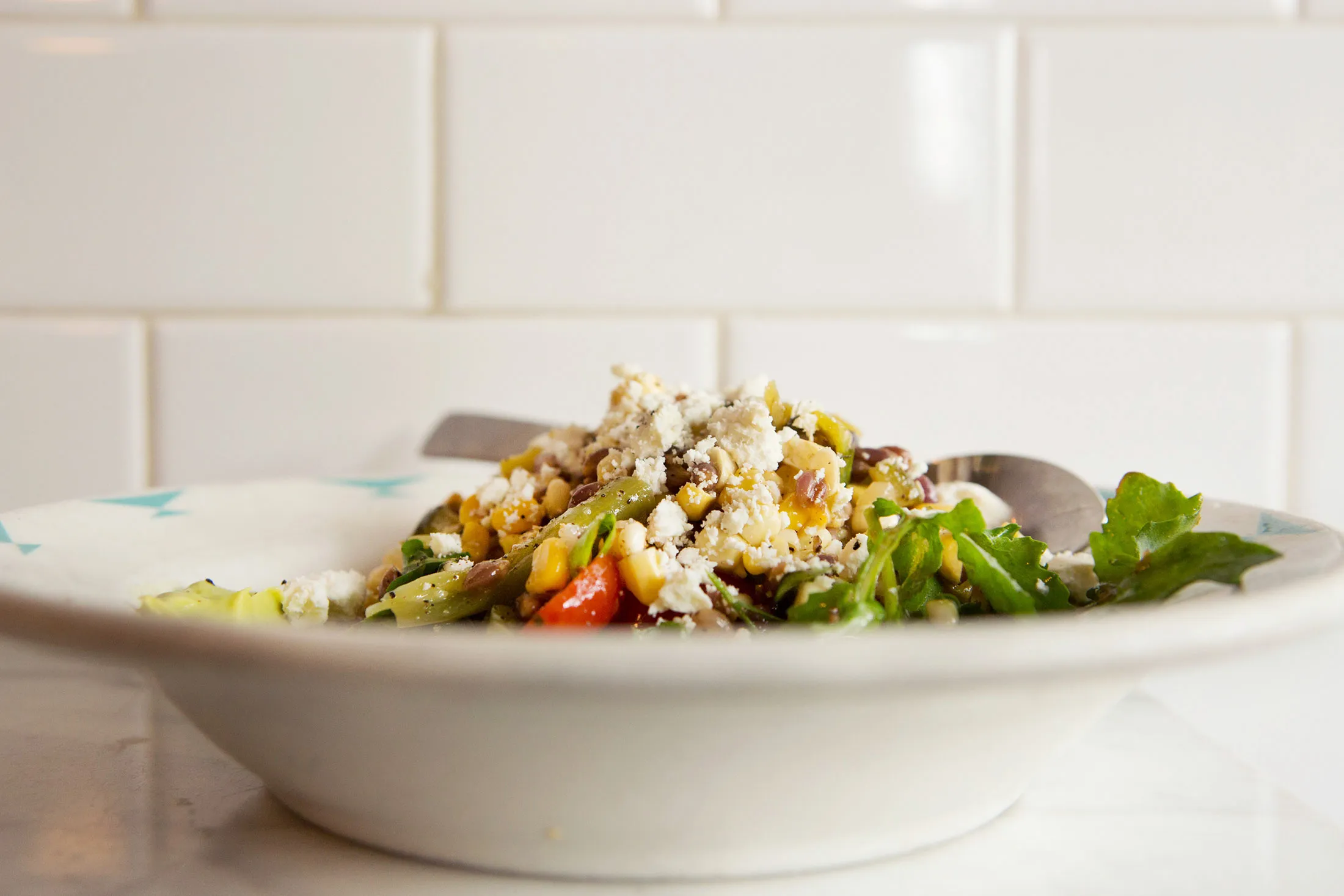 一款夏季的豆类沙拉,配有贝壳豆和玉米。