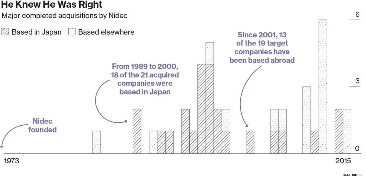 这些企业包括自1973年成立以来Nidec收购的41家公司以上。许多公司处于困境,濒临破产。2001年之后的大多数收购将Nidec的业务扩展到日本以外。该公司是全球最大的精密电机制造商,供应超过80%的硬盘驱动器电机。近年来,Nidec开始为工厂设备、家电和汽车生产电机。公司的市场价值为230亿美元,而永森的股份价值为20亿美元,使他成为日本第十富有的人。