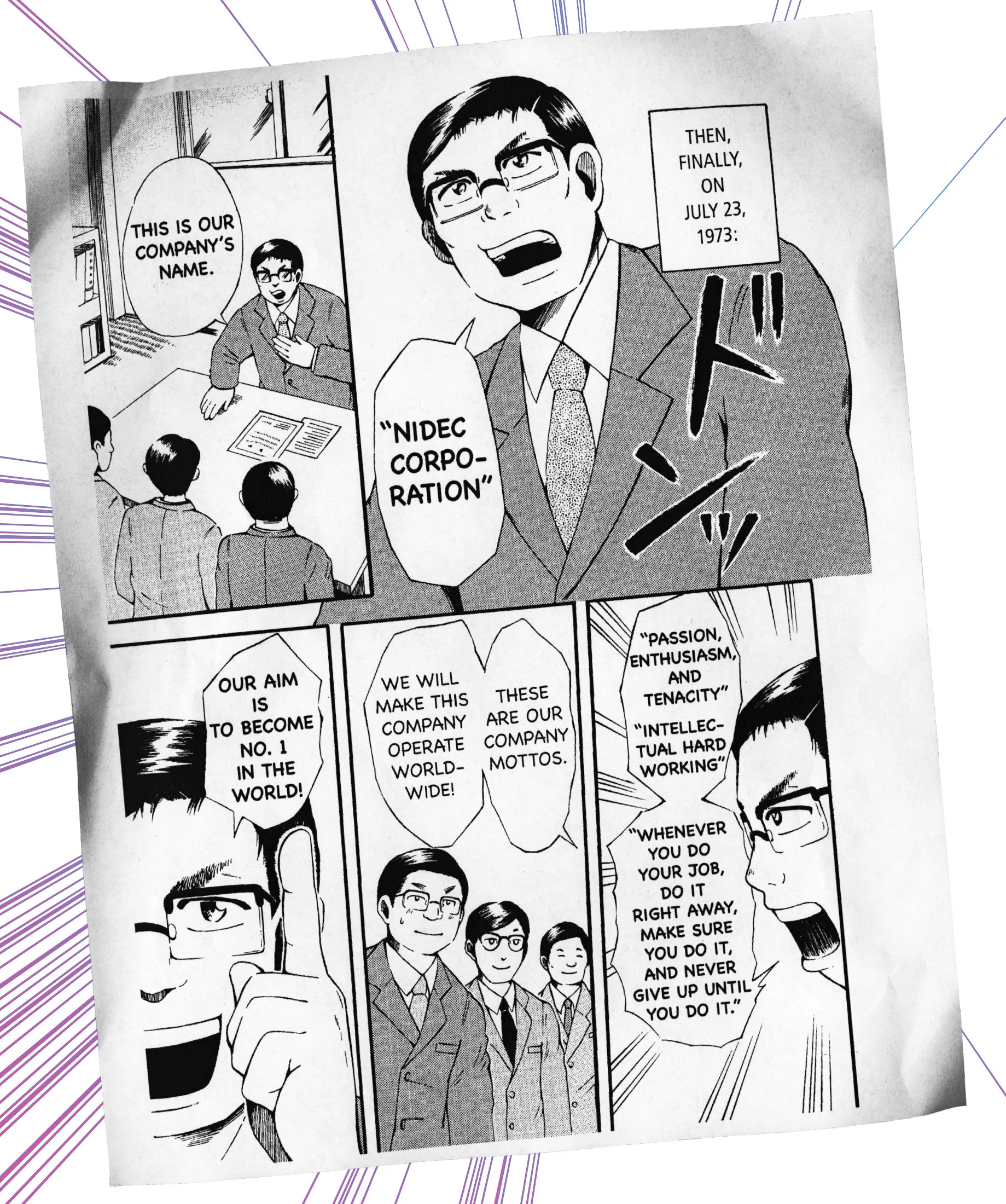 他自夸从贫困到富裕的崛起:从三名员工开始,他在母亲位于京都的农舍旁的预制小屋里制造小电动机。日本公司质疑这位新兴企业家的能力,拒绝向他下订单。因此,长森前往美国,与3M签订合同,为录音机制造一种更小的电动机。“有了这个,宁德时代的声誉在日本国内外都得到了提升,”根据这本漫画书的说法。