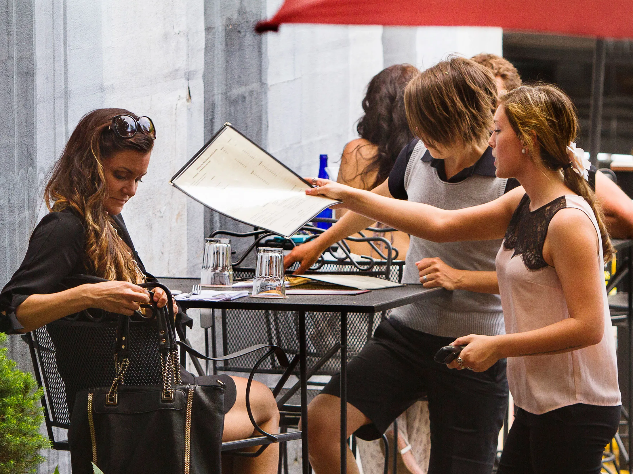 波特兰的The Grill Room的一名工作人员在7月7日为顾客安排座位。