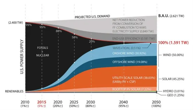 斯坦福大学的马克·雅各布森等人提出的计划旨在到2050年将美国能源转变为100%可再生能源,涉及逐步减少对化石燃料和核能的依赖,并增加风能、太阳能和水能的供应。能源与环境科学对风能(占供应的50%)和太阳能(占供应的45.25%)的高度依赖带来了挑战,即在阳光不照或风力减弱时满足峰值消费者能源需求。雅各布森和他的团队提议通过组装一系列创造性的能源储存设备来实现这一目标,而不需要任何新的电池技术,例如将多余的能量以热量的形式输送到地下,稍后再提取使用,或者利用便宜的非高峰电力制造冰,然后在高需求期间用于冷却建筑。路线图表示,到2050年可以“每30秒匹配负载而不损失,持续六年”;作者有一项辅助研究来支持这一说法,尽管它尚未发布。