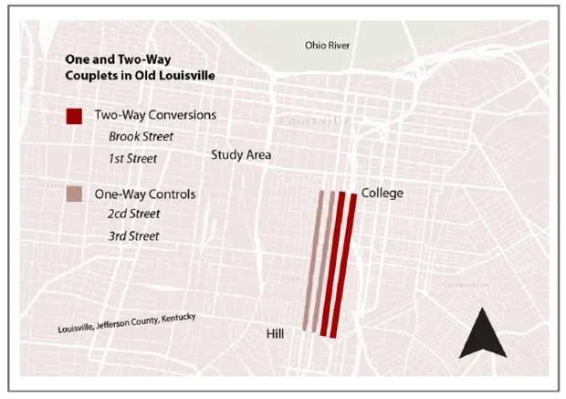 路易斯维尔也在信奉者之列。2011年,该市在老路易斯维尔地区转换了两条单行道(布鲁克街和第一街)。虽然最初设计为双向街道,但布鲁克街和第一街在二战后变为单行道,以符合当时以汽车为主的工程设计。在倡导这一变化时,当地官员大卫·詹姆斯提到了对 更平静的街道和经济发展的需求。