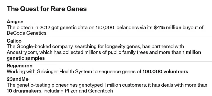 制药公司还在投资收购和合作,以获取可能导致更多药物的基因信息。阿姆根在2012年以4.15亿美元收购了冰岛生物技术公司DeCode Genetics,以获取其关于冰岛超过一半成年人口的庞大数据库。基因泰克正在与硅谷初创公司23andMe合作,该公司已向100万消费者销售其99美元的DNA唾液检测工具,想要了解更多关于他们的健康和家族历史的信息——超过80%的人同意将他们的数据用于研究。基因泰克的合作将研究帕金森病的遗传基础。而再生元与宾夕法尼亚州的盖辛格健康系统签署了一项协议,以对超过100,000名志愿者的基因进行测序。