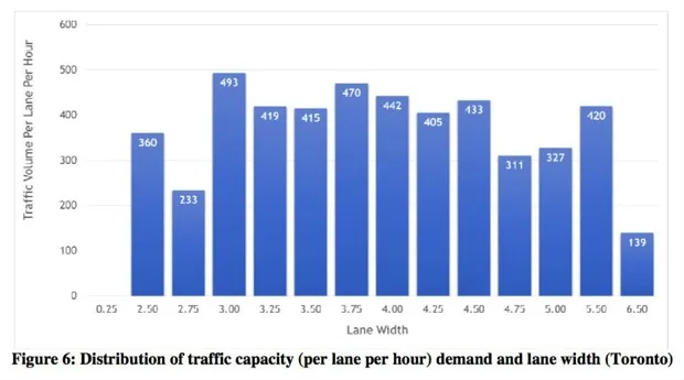 对两座城市数年的事故数据分析显示,东京的车道宽度在10.2英尺(3.1米)左右和多伦多的10.5英尺(3.2米)之间存在明显的最佳点。随着车道变得过于狭窄,事故率增加,驾驶员的空间不足;而当车道变宽时,事故率也会上升。卡里姆写道,这些结果“清楚地表明了为什么‘车道宽度的传统智慧’经不起科学检验。”