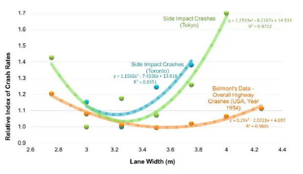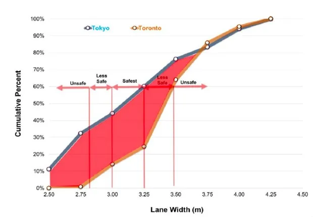 对两座城市数年的事故数据分析显示,东京的车道宽度在10.2英尺(3.1米)左右和多伦多的10.5英尺(3.2米)之间存在明显的最佳点。随着车道变得过于狭窄,事故率增加,驾驶员的空间不足;而当车道变宽时,事故率也会上升。卡里姆写道,这些结果“清楚地表明了为什么‘车道宽度的传统智慧’经不起科学检验。”
