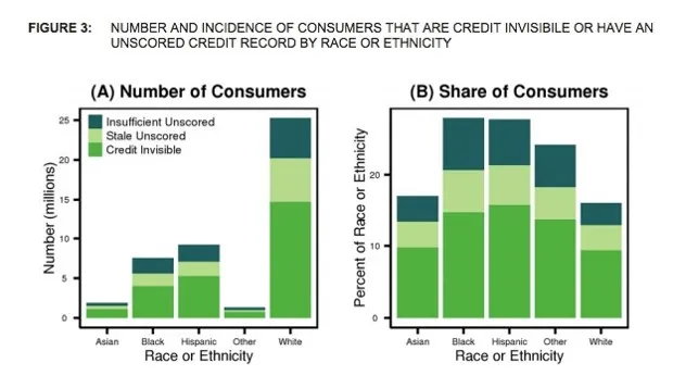 国家西班牙裔房地产专业人士协会这些细微差别使许多拉丁裔美国人变得“信用隐形,”这是联邦消费者金融保护局(CFPB)用来描述那些没有足够信用历史供贷款人追踪,或根本没有历史的人。根据CFPB的数据,大约有2600万美国人属于这一类别。然而,非裔美国人和西班牙裔在信用方面的可见性远低于其他群体,这两个群体中各有15%的人属于这一类别,而白人中只有9%。这种种族/民族差异在所有年龄组中都存在。