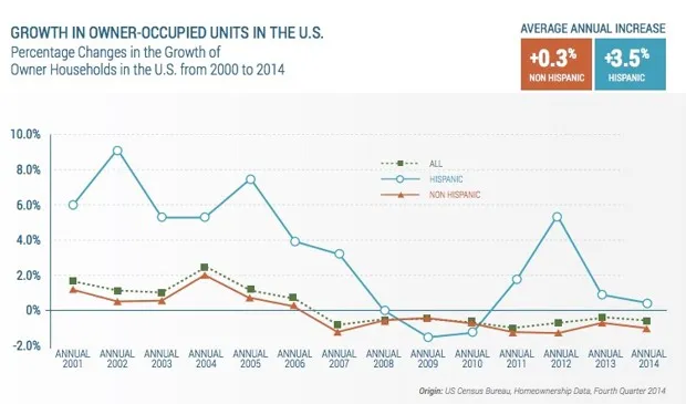 2014年,西班牙裔美国人的房屋拥有率为45.4%,是自2000年以来的最低水平,也是首次在同一时间段内降至46%以下。根据 国家西班牙裔房地产专业人士协会(NAHREP)对人口普查局数据的分析,这一比例自2007年达到49.7%峰值以来,每年稳步下降。尽管西班牙裔的收入在上升——他们是唯一一个在去年 贫困率显著下降的主要种族或民族群体,依据皮尤研究中心的数据。