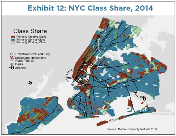 在居住方面,创意阶级集中在曼哈顿及布鲁克林的邻近地区,并在其他三个区的小集群中分散。服务阶级和工人阶级则聚集在其余的社区,这些社区往往离便利设施、交通和曼哈顿的就业中心较远。