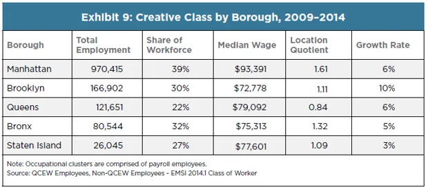 上表同样来自报告,展示了五个区的阶级构成。创意阶层的工作高度集中在曼哈顿,几乎占据了近一百万名工人——占城市创意阶层总数的39%。布鲁克林仅有166,902个创意阶层工作岗位,这些工作的平均薪资为72,778美元,而曼哈顿则在90,000美元及以上。皇后区的创意阶层占劳动力的22%,有121,651名创意阶层工人,其余在布朗克斯(80,544)和斯塔滕岛(26,045)——这些岗位的薪资均远低于曼哈顿的类似工作。