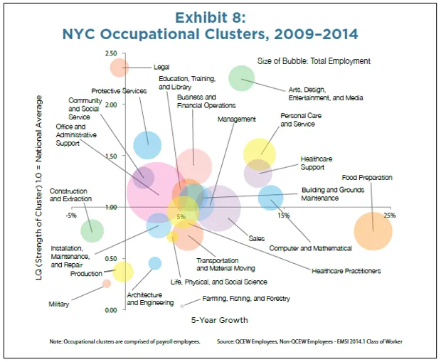 下面的图表来自我们的研究,深入分析了城市的创意经济及其关键职业集群。气泡越大,总就业人数越高。x轴表示2009-2014年的就业增长,而y轴表示位置商,即纽约相对于全国其他地区的职业集中度。