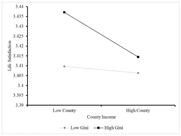 在收入不平等较高的县(以基尼系数衡量,基尼系数高反映更多不平等),县收入与生活满意度之间的负相关关系更为明显。JPSPCheung和Lucas也计算了影响的成本。例如,样本中家庭收入平均约为41,500美元的人。生活在一个更富裕的县通过社会比较导致生活满意度降低,但如果那个地方的收入不平等较低,人们只需赚取约1,000美元来弥补幸福感的下降。但如果那个地方的收入不平等较高,社会比较的成本飙升至每年7,700美元。