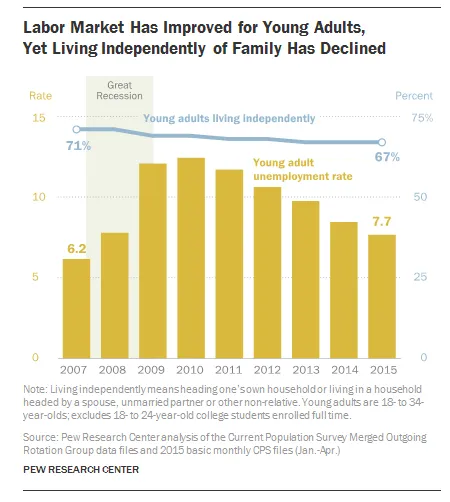 在2015年初,67%的千禧一代与家人分开居住,低于2010年的69%和2007年的71%。大部分下降可以用年轻人搬回家与家人同住来解释。