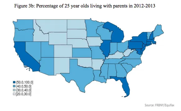然而,一个解释可能在于地方经济的影响,经济增长可能对千禧一代的独立性产生相反的效果。纽约联邦储备银行最近的一份报告发现,虽然改善的地方就业市场可能支持年轻人独立生活,但它也推高了住房成本,使得年轻人不得不回家。下面是该报告中包含的一张地图,显示了25岁以下与父母同住的年轻人的全国分布,强调了州级经济气候如何影响独立性。