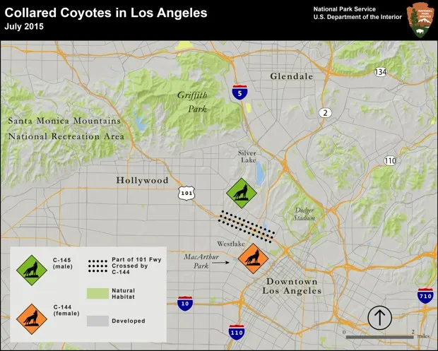 在五月,公园的研究人员给两只郊狼装上了项圈,分别命名为C-144和C-145,因为它们是国家公园管理局在南加州追踪的第144和145只郊狼。通过GPS项圈获得的位置数据,公园官员发现144大部分时间都待在密集人口的西湖社区,而145则在稍远的银湖安家。