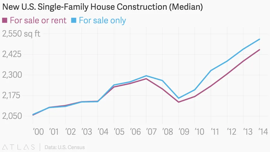 哦,当然,2007年至2009年间,新建单户住宅的平均面积确实略有下降。在1990年代缓慢上升,并在2000年代前半段更快增长后,派对在2008年戛然而止,当时新房的平均平方英尺下降了3平方英尺。