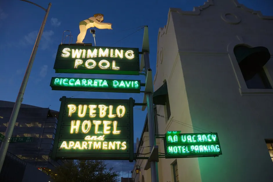 但像这样的招牌并不总是被视为历史地标。事实上,从1960年代末开始,霓虹招牌变得或多或少是个眼中钉——以至于*《生活》*杂志曾宣称斯皮德威大道,图森的一条霓虹灯照亮的道路,是美国的“最丑的街道。”